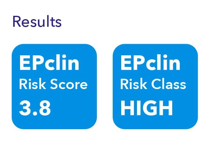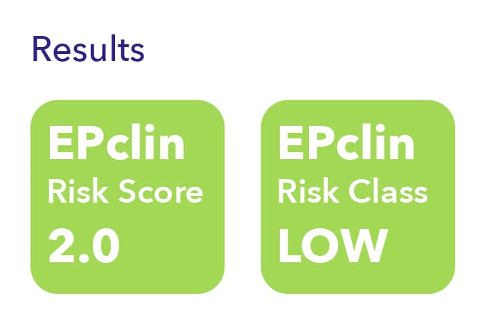 You will receive a number called the EPclin Risk Score. It combines the activity of certain genes in your tumor with clinical factors like tumor size and lymph node status. This score, shown on a scale from 1 to 6, helps estimate your individual risk of breast cancer coming back – and places you into a personal risk class.