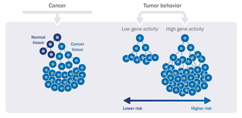 Genes are small sections of DNA, the material in your cells that carries your hereditary information and the instructions for how your cells work. The activity of some of these genes in your tumor cells can influence how quickly cancer grows or spreads – and how it might respond to treatment.