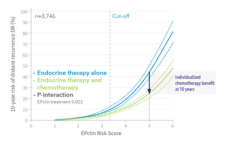 - Haut EPclin Score de risque : Les femmes de ce groupe qui ont reçu un traitement endocrinien + une chimiothérapie avaient un risque de récidive à 10 ans significativement plus faible que celles qui ont reçu un traitement endocrinien seul. Cela indique que les patientes ayant un score de risque élevé bénéficient d'une chimiothérapie adjuvante.