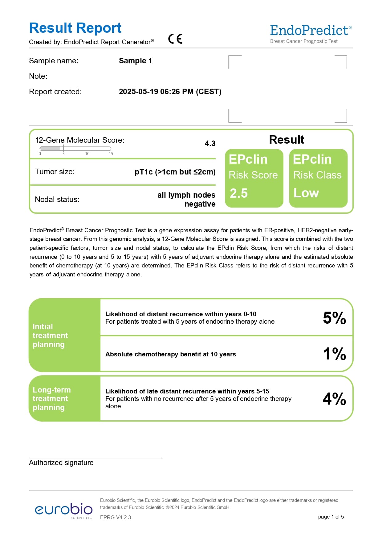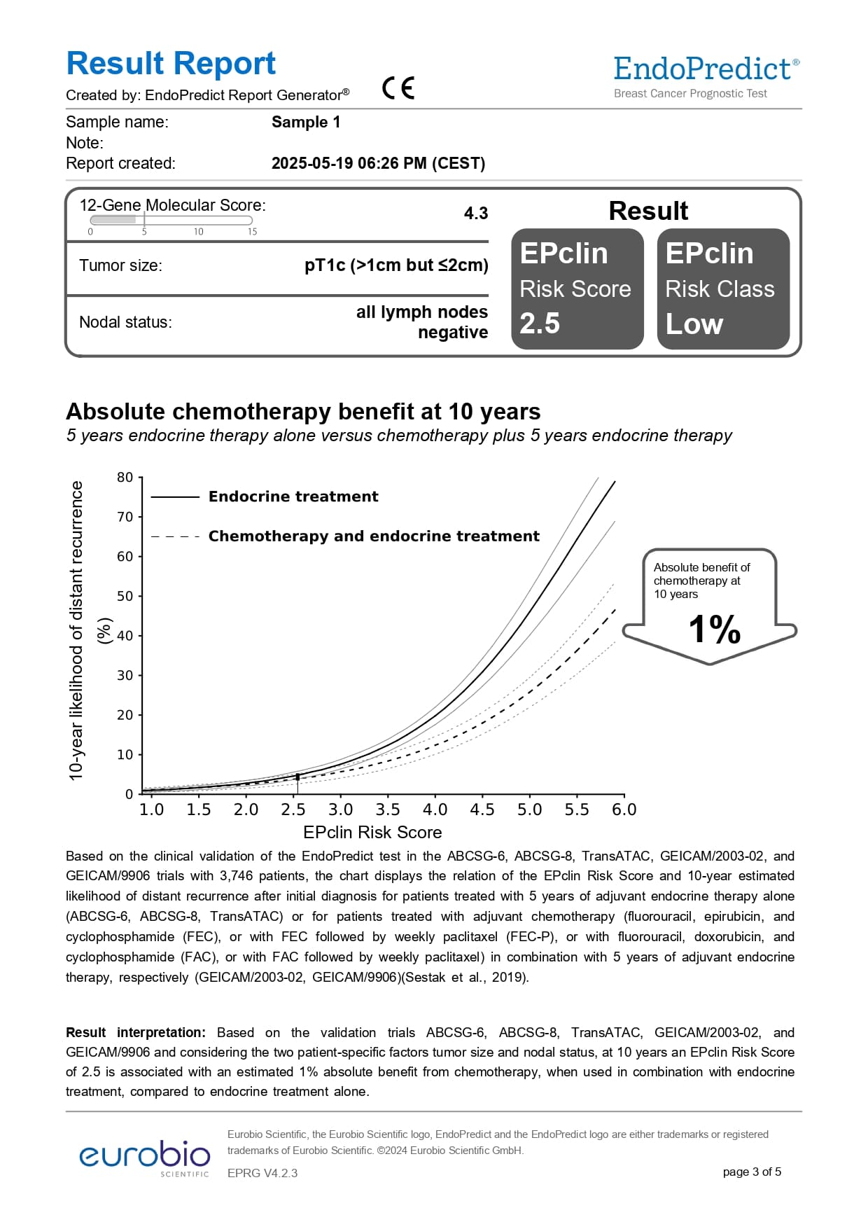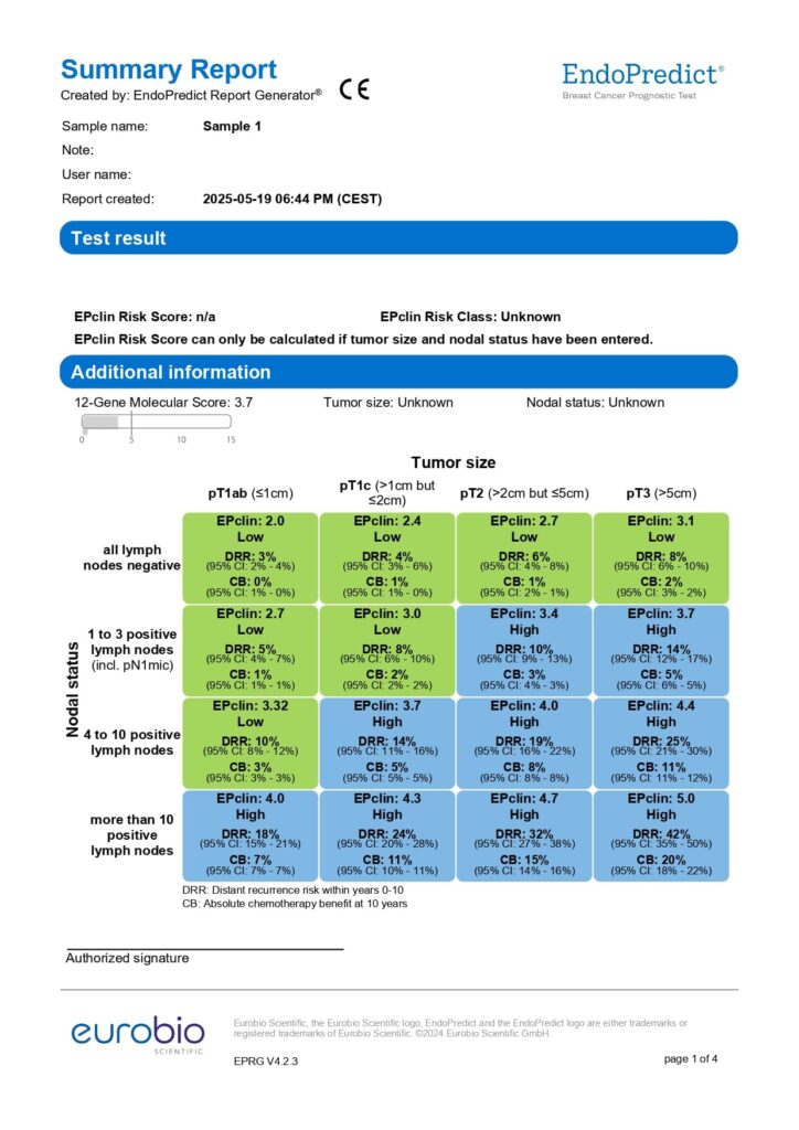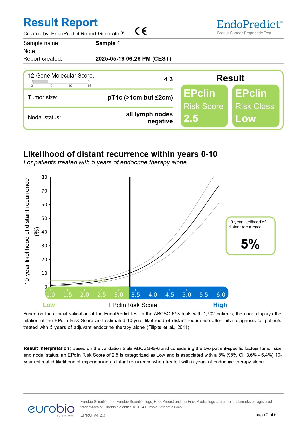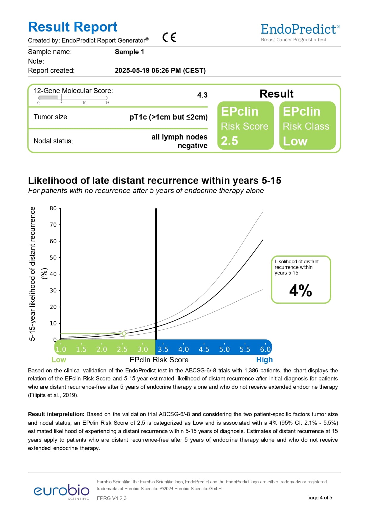 Le rapport du test EndoPredict fournit des informations claires et cliniquement exploitables pour aider à guider les décisions de traitement dans le cancer du sein ER-positif/HER2-négatif au stade précoce. En combinant les données moléculaires du score moléculaire à 12 gènes avec des facteurs cliniques tels que la taille de la tumeur et l'état des ganglions lymphatiques, le rapport fournit le score de risque EPclin complet - un outil puissant pour déterminer le risque de récidive à distance et le bénéfice de la chimiothérapie pour une patiente donnée.1,2,3